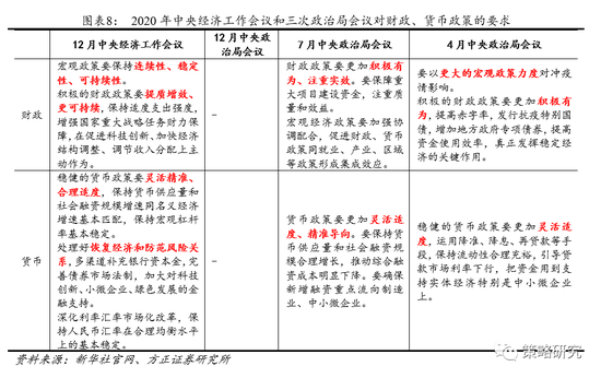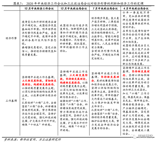 中央经济工作会议同今年三次讨论经济工作的政治局会议在工作基调上保持一致,宏观政策保持连续稳定。同今年4月、7月、12月召开的政治局会议对比,中央经济工作会议坚持用全面、辩证、长远的眼光看待当前经济形势,既肯定了我国在疫情防控、经济运行逐步恢复常态方面的成绩,展现出我国对道路的自信和满意,同时也不忘增强忧患意识,对未来经济形势的复杂严峻程度保持高度重视。工作基调方面,四次会议均保持高度一致,重申了一直以来坚持的稳中求进工作总基调,新发展理念进一步强化,以深化供给侧结构性改革为主线,扎实做好“六稳”、“六保”工作,展现出中性偏积极的工作总基调。宏观政策方面,今年以来的财政、货币政策基调遵循了连续性、稳定性、可持续性三个要求。从财政政策看,三次会议均提出要实施积极的财政政策。在4月疫情对经济的负面冲击依然较明显之际,政治局会议提出要以更大的宏观政策力度对冲疫情影响,财政政策要更加“积极有为”;在7月复工复产逐步好转的背景下,财政政策在积极有为的表述后面又加上了“注重实效”四个字;而在中央经济工作会议上则提出财政政策要“提质增效、更可持续”,表达了在政策方面要保持连续稳定,不会出现急转弯。从货币政策看,三次会议均坚持了要实施稳健的货币政策的总基调。4月的政治局会议提出货币政策要“灵活适度”,并且要求运用降准降息等手段保持流动性的合理充裕;在7月经济超预期恢复、直达实体的货币政策工具得以落实之后,在灵活适度的基础上,“精准导向”又成了货币政策新的要求;中央经济工作会议在货币政策方面提出“灵活精准、合理适度”,保持货币供应量和社会融资规模增速同名义经济增速基本匹配,这与之前几次政治局会议的有关表述是相辅相成的。