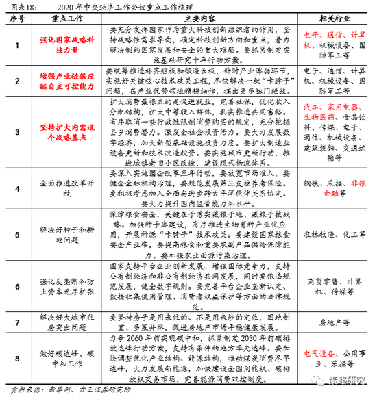 4、经济工作重点任务对产业投资有哪些启示?从2020年中央经济工作重点任务看,科技与消费仍是中长期政策重点支持领域。