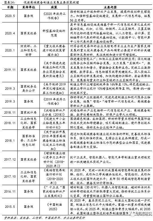 2017年至今,供给侧改革不断走向深入,培育经济增长新动能,推动经济高质量发展。自2015年以来,“供给侧改革”一直作为经济工作核心,存在两层含义。一方面,2015年中央经济工作会议提出的“三去一降一补”重点淘汰落后产能、过剩产能,破除无效供给,是针对经济发展旧驱动力的改革。另一方面,2016年中央经济工作会议提出的“实施创新驱动发展战略,推动战略性新兴产业蓬勃发展”,以及2017年提出的“大力培育新动能,强化科技创新”,则是供给侧改革的进一步深入,是对经济发展新动能的挖掘,是推动经济结构转型的关键。相较“三去一降一补”的短期政策效应相比,推动经济高质量发展明显是更长期的政策指引,无论对新兴产业发展的催化效应还是对科技、创新企业的政策红利都更加持续。2015年国务院发布的《中国制造2025》是中国政府实施制造强国战略第一个十年的行动纲领,旨在通过“三步走”实现制造强国的战略目标,即,第一步,到2025年迈入制造强国行列;第二步,到2035年中国制造业整体达到世界制造强国阵营中等水平;第三步,到新中国成立一百年时,综合实力进入世界制造强国前列。2016年国务院发布的《“十三五”国家战略性新兴产业发展规划》指出到2030年战略性新兴产业发展将成为推动我国经济持续健康发展的主导力量,在此期间,航空航天装备、海洋工程装备及高技术船舶、先进轨道交通装备、高档数控机床、机器人装备、现代农机装备、高性能医疗机械、先进化工成套装备等八大高端装备行业步入政策红利期。
