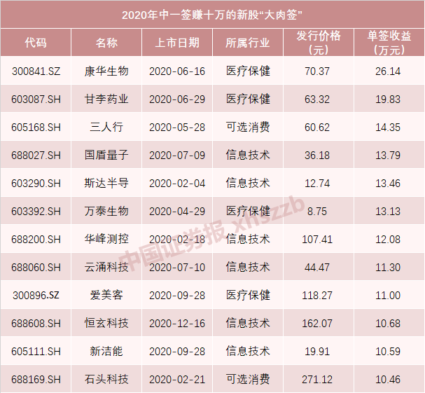 东方财富数据显示,今年“中一签赚十万”的新股已有12只,平均每月一只。康华生物以26.14万元的单签收益排名榜首,甘李药业、三人行分别以19.83万元、14.35万元排在第二位和第三位。
