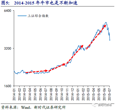 (3)A股牛市的形态。由于投资者结构和经济发展阶段的不同,A股历史上牛市的波动规律和美股完全不同。2005-2007年和2014-2015年,A股的牛市都是不断加速的过程,上涨的初期最慢,中期开始加速,末期的速度甚至会更快。
