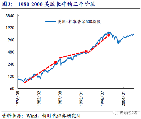 (2)美股牛市的形态。这三个阶段在美股上非常明显,美股牛市中一般第一阶段和第三阶段上涨速度更快,因为有估值抬升的因素,而在第二个阶段,由于是盈利边际变化推动,相对来说,速度更慢。这一形态在美股中经常出现,1980-2000年长达20年的大牛市、2003-2007年的小牛市和2009-2020年这一尚未完成的牛市中,美股都表现出这一波动规律。