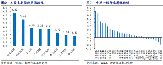 上周A股有所上涨,其中创业板50(4.32%)、创业板指(3.46%)领涨。申万一级行业中,有色金属(7.05%)、电气设备(6.59%)和医药生物(4.25%)领涨,纺织服装(-1.90%)和通信(-1.19%)领跌。概念股中,黄酒指数(24.79%)、锂矿(14.70%)和钴指数(10.97%)领涨,4G指数(-4.68%)、大数据指数(-4.04%)和K-12指数(-4.00%)领跌。