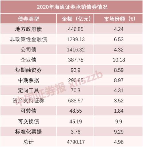 Wind数据显示,截至12月20日,海通证券在2020年的债券总承销金额为4790.17亿元,行业排名较去年下降一个名次,由行业第五名降至行业第六名。目前的市场份额为4.96%,今年共计承销债券数量为1703只。具体到债券分类上,承销非政策性金融债的规模为1299.13亿元,承销公司债的规模为1416.32亿元,此两项是海通证券债券承销的主要类别,此外,资产支持证券规模为688.57亿元。