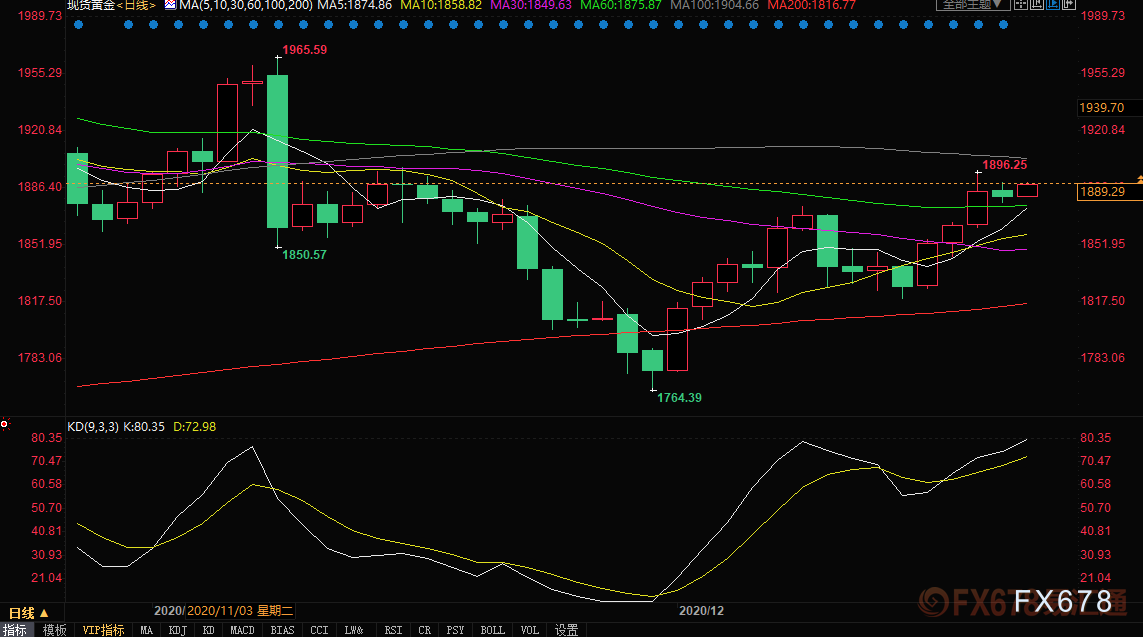 在英国首相鲍里斯宣布对伦敦和英格兰东南部大部分地区实施全面封锁后,对于疫情的担忧情绪升级,在加上市场憧憬美国有望再周一投票推出刺激计划,推动金价周一上涨近20美元,最高触及1899.52美元/盎司,创一个月以来新高。