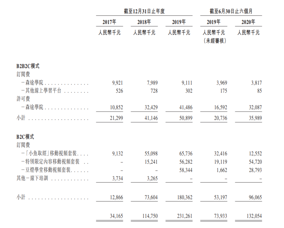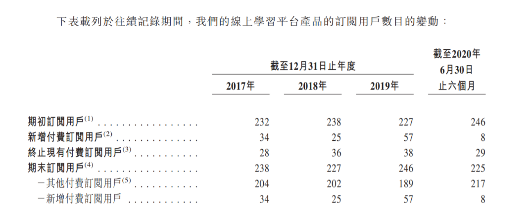 招股书显示,截至2017年、2018年及2019年12月31日以及2020年6月30日,森途学院分别有238名、227名、246名及225名线上学习平台付费订阅用户;而新付费订阅用户只有34名、25名、57名及8名。