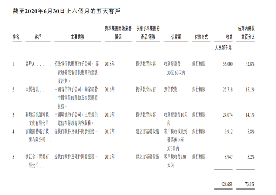 客户规模集中,可能是其规模增长缓慢的重要原因。截至2017年、2018年及2019年12月31日止年度以及截至2020年6月30日止六个月,来自前五大客户的收益分别为0.85亿元、1.1亿元、2.4亿元及1.2亿元,分别占当期营收的48.9%、45.3%、67.0%及73.0%。