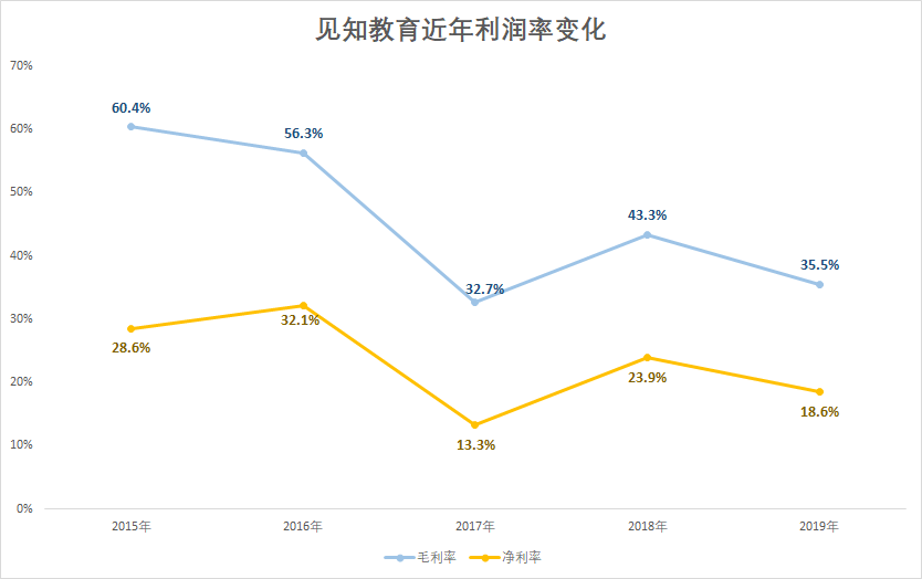 但即便如此,见知教育的毛利率和净利率依然在下降。2017-2019年,见知教育的毛利率分别为32.7%、43.3%、35.5%。最近五年来,毛利率水平已经由60.4%下滑到35.5%,减少约25个百分点。同样,净利率也在五年间减少了10个百分点。