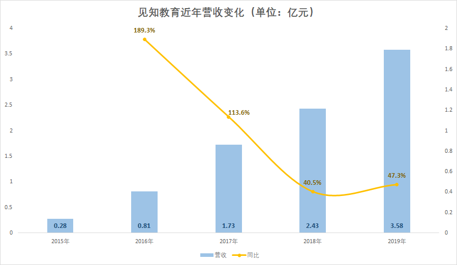 2015至2019年五年间,见知教育的营收从2790万元增加到3.58亿元,看起来复合增长率高达66.63%。但实际上,2018-2019年间的增速与之前相比明显放缓。规模没有“量变式增长”的同时增速却在下降,这并不是一个积极的信号。