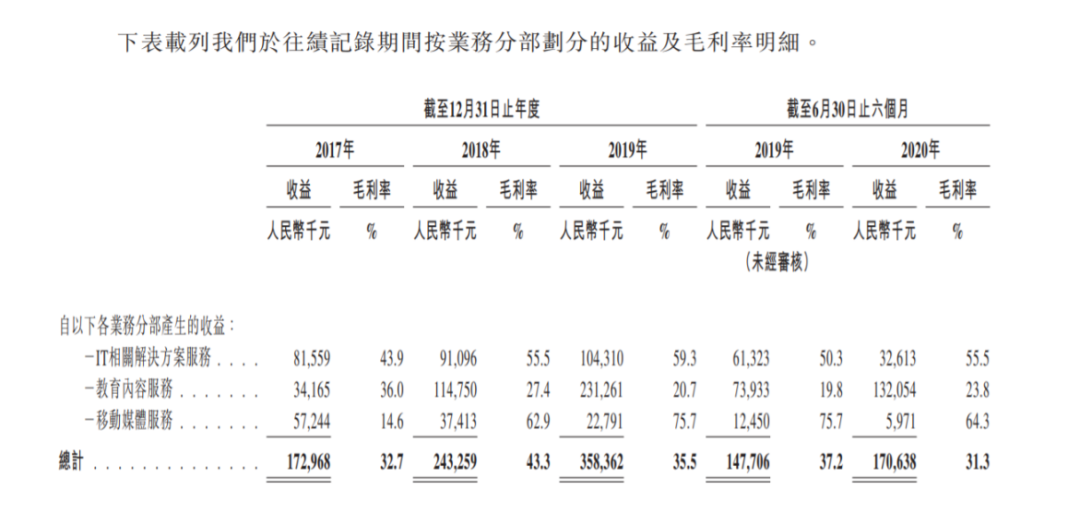 教育内容服务是一大亮点,其收入占比从2017年的19.8%增长至2019年的50.1%。2020年上半年更是达到了77.4%,成为其第一大收入来源。此消彼长,移动媒体服务的收入占比从33.1%大幅降至6.4%,IT相关解决方案服务收入从47.1%降至29.1%。
