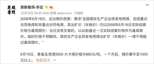 12月12日,发改委出大招补救,召集了十家电企开座谈会,要求电力企业煤炭采购价格不得超过640元/吨,若超过,需单独报告发改委,发改委对煤源进行调研。