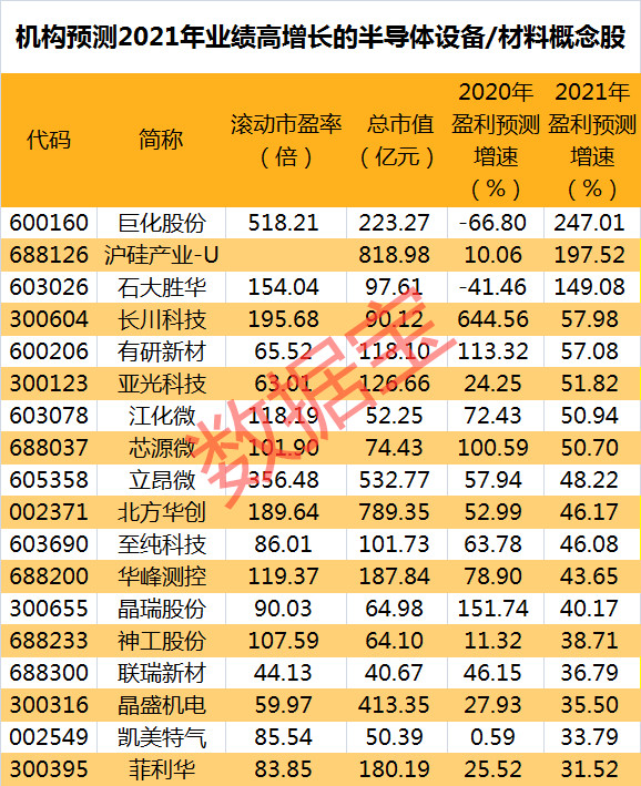 证券时报·数据宝统计显示,在机构普遍预测此次事件中,有望受益的国内半导体设备和材料概念股中,机构预测2021年盈利增速超30%的共有18家公司。