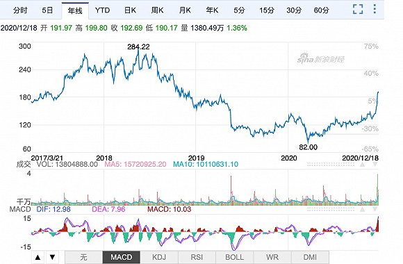 过去三年,百度股价的峰值是284.22美元(市值接近千亿美元),出现在2018年5月16日。同年5月18日,百度宣布时任总裁陆奇离职,此后股价一路下跌。