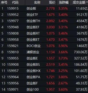 以今天大涨的创业板指为例,两市跟踪创业板指数的ETF目前场内有14只,由于标的相同所以涨幅相近平均在3%以上,在总共369只ETF中,平均排在10—20位左右,轻松跑赢了330多只ETF。
