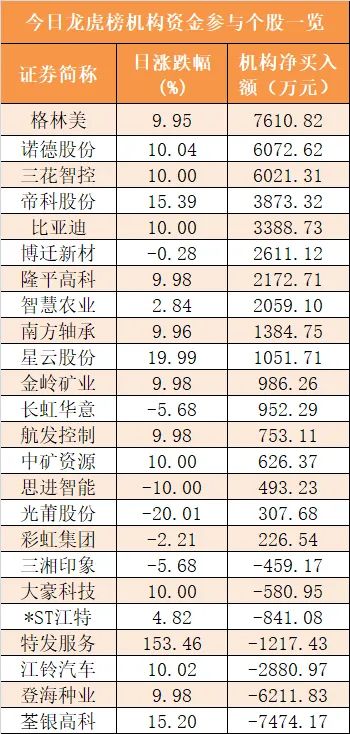 盘后龙虎榜数据显示,机构现身24股,其中格林美等17股呈现机构资金净买入,荃银高科等7股呈现机构资金净卖出。