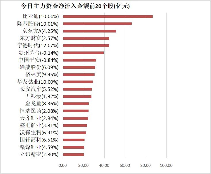 比亚迪主力资金净流入86.35亿元居首