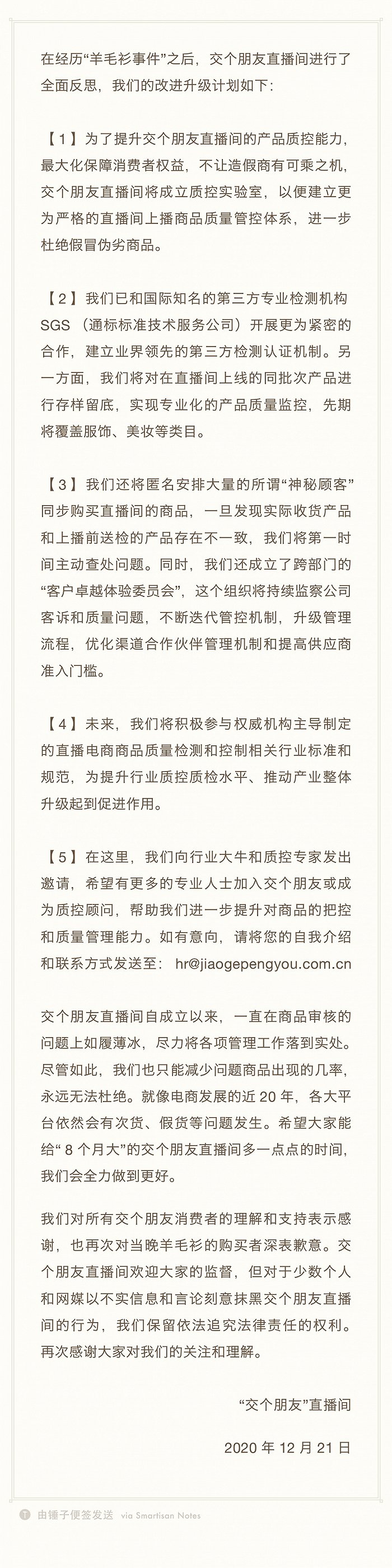 12月21日消息,交个朋友直播间官方微博及罗永浩个人微信公众号发文称,在经历“羊毛衫事件”之后,交个朋友直播间进行了全面反思,决定全方位整改升级。
