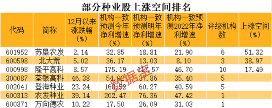 从机构一致预测净利增速来看,隆平高科今年、明年净利增速均有望超过100%。登海种业等个股未来净利也有望高速增长。