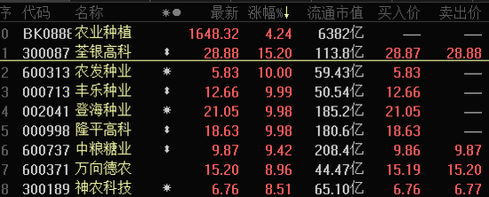 12月份以来,种业板块持续大涨,荃银高科领涨,累计涨幅超过46%居首。此外,农发种业、丰乐种业、神农科技、登海种业等多只个股涨幅均超过20%。