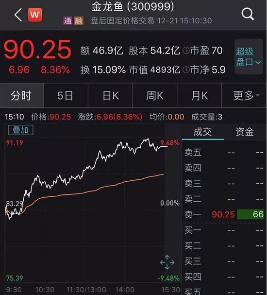 12月21日,创业板指早间高开后持续拉升,全天大涨3.66%。其中金龙鱼涨8.36%,不仅股价突破90元大关,创历史新高,其市值更是打败迈瑞医疗成为创业板第二,逼近5000亿大关。