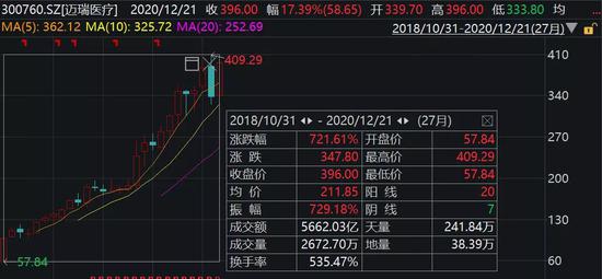 自2018年10月上市至今,迈瑞医疗涨幅已超720%,而今年以来涨幅也接近120%,最新总市值接近5000亿,堪称“医疗器械茅”。