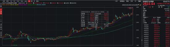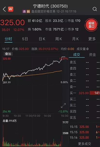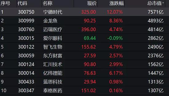 一是宁德市代大涨12.07%,收盘价为325元,总市值突破7000亿元,为7571亿元。Wind数据显示,宁德时代今天盘中股价首次突破300元,市值突破7000亿元,这是创业板史上首次有股票市值突破7000亿元。宁德时代今年以来涨势凌厉,年内涨幅已超过205%。