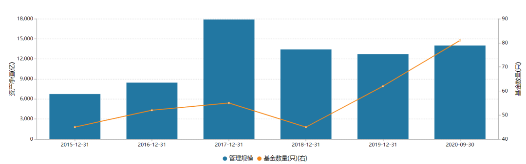 天弘基金成立至今已有16年,目前坐稳公募基金公司管理规模头把交椅。截至今年三季度末,该公司非货币管理规模为1179.05亿元,同比增长142.82%。其中,权益类基金管理规模为501.75亿元,同比增长130.55%。