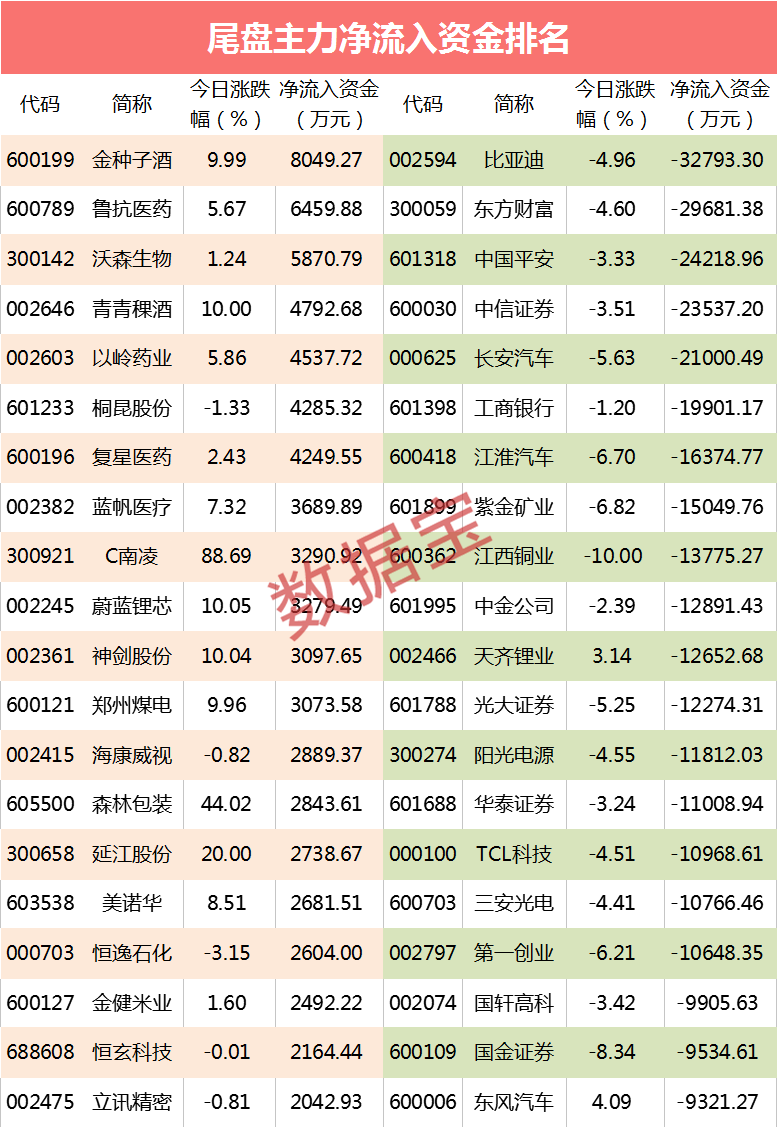 17股尾盘出逃超亿元,三类股资金出逃明显,其中新能源车龙头比亚迪尾盘资金大幅流出3.28亿元,最新市值跌破5000亿元。