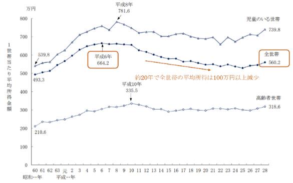 可以看出,从平成3年,也就是91年泡沫破裂之后,日本全国平均的家庭收入并没有怎么受到影响,甚至还涨了几年,直到平成8年,也就是96年,才开始往下走。而在平成6年到平成28年的这22年里,全国平均家庭收入慢慢地跌了100万日元左右。也就是从原先水平大约下降了15%。结合上面那张房价的图,跌幅其实也接近这个数字。