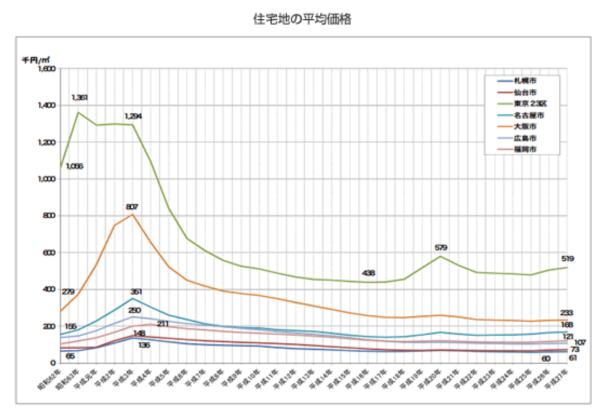 究其原因,日本自从86年到91年之间的泡沫经济被戳破后,住宅用地的平均价格就一直跌了15年。下图有些模糊,不过可以看到最明显的绿色线,也就是东京23区的线,从平成3年一直跌到了平成18年。也就是说从91年泡沫戳破后,直到2006年,日本的住宅用地价格才有一些起色。但如图所示,也并没有涨回来很多。