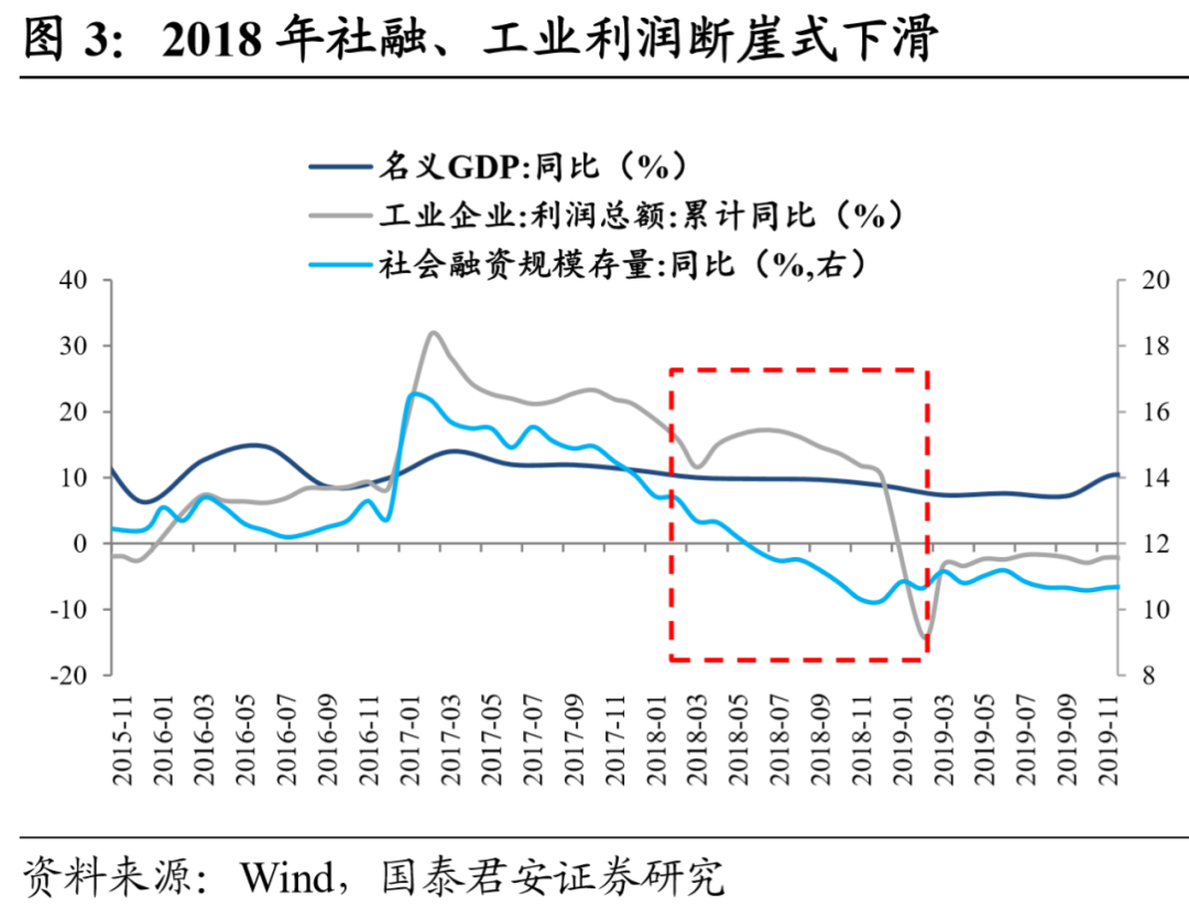 经济断崖式下滑+加大逆周期调节力度,央行节前大幅放水。受2017年严监管和金融去杠杆冲击,2018年社融和工业利润增速断崖式下滑。2018年底中央经济工作会议指出要“加大逆周期调节力度”,叠加年底资金压力大和股市走弱,央行全面降准1个百分点置换到期MLF+普惠降准0.5或1.5个百分点+创设TMLF操作2575亿元,合计释放长期资金约8000亿元。
