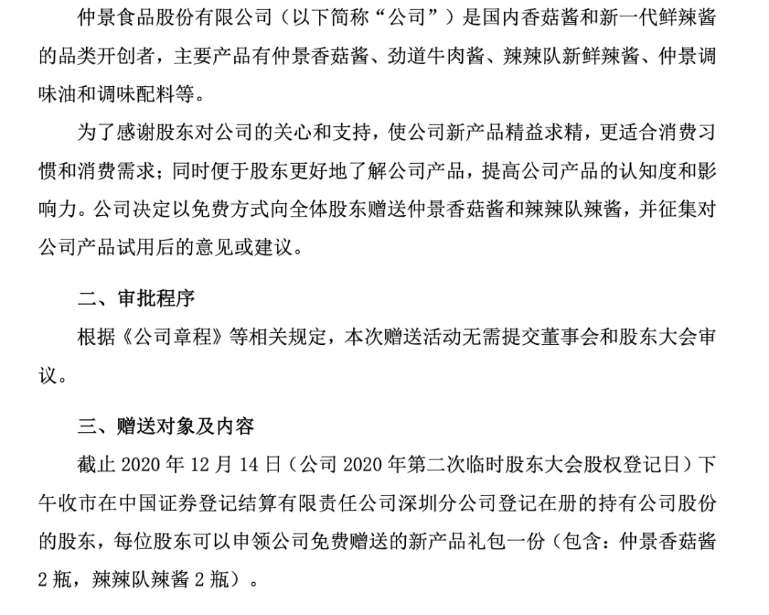 公告称,凡是在截至12月14日下午收市在中国证券登记结算有限责任公司深圳分公司登记在册的持有公司股份的股东,每位股东可以申领公司免费赠送的新产品礼包一份(包含仲景香菇酱2瓶,辣辣队辣酱2瓶)。