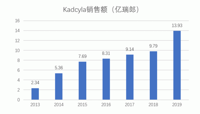 但相较于郝赛汀2019年全球销售额60.39亿瑞士法郎来说,Kadcyla还仍未达到罗氏预期。