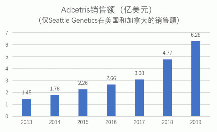 Seattle Genetics 在Adcetris的销售额分别为4.77亿美元、6.28亿美元;