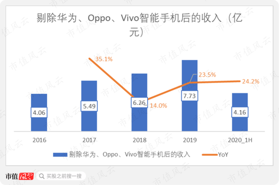 即使剔除来自华为、Oppo、Vivo三家公司智能手机的收入,兆威2019年的营收仍然达到7.73亿,2016-2019年的CAGR达到23.9%,今年上半年也增长了24.2%。