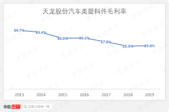 再来看毛利率,2019年天龙股份汽车类塑料件的毛利率是25.6%,低于兆威机电的35.1%,两者都处于下降趋势。凯中精密则没有披露相应业务的毛利率。