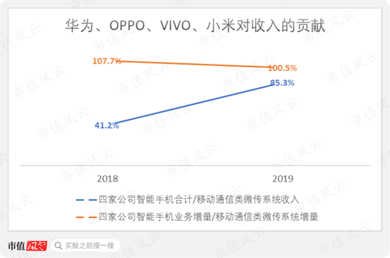 从增量上来看,2018年来自四家公司智能手机的收入增长了1.3亿,占到当年移动通信类微传系统增量的107.7%。2019年,这一数字则为100.5%。