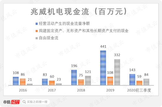 2019年,兆威机电的经营活动净现金流为4.41亿元,自由现金流3.32亿元。自由现金流连续四年为正,公司具备造血能力。