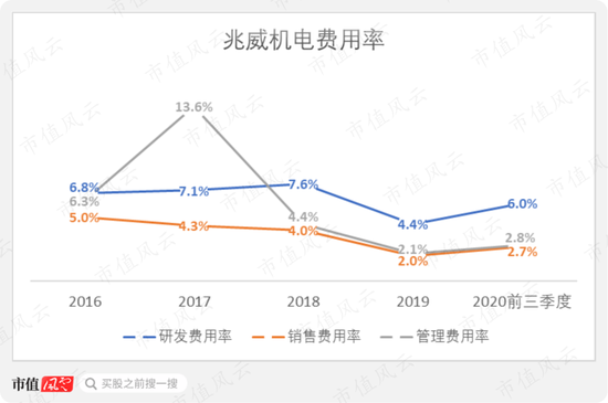 2019年,研发费用为7905万元,同比增长了38.2%,和2017、18年的营收增速基本一致。但是受到2019年收入大幅增长基数扩大的影响,研发费用率降至4.4%。