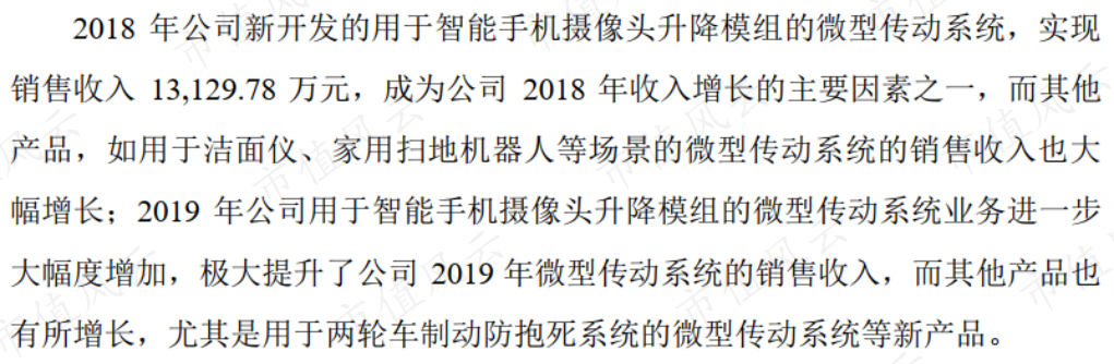 兆威机电在招股书中说,手机摄像头升降模组在2018年卖了1.32亿元,占当年移动通信类微传系统的41%。2019又进一步大幅增长,但公司没有披露详细数据。