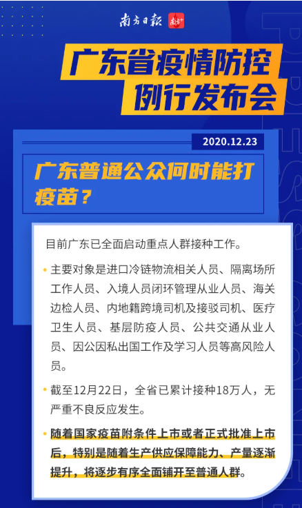 目前,广东已全面启动重点人群接种工作,主要对象是进口冷链物流相关人员、隔离场所工作人员、入境人员闭环管理从业人员、海关边检人员、内地籍跨境司机及接驳司机、医疗卫生人员、基层防疫人员、公共交通从业人员、因公因私出国工作及学习人员等高风险人员。截至12月22日,全省已累计接种18万人,无严重不良反应发生,总体平稳有序。