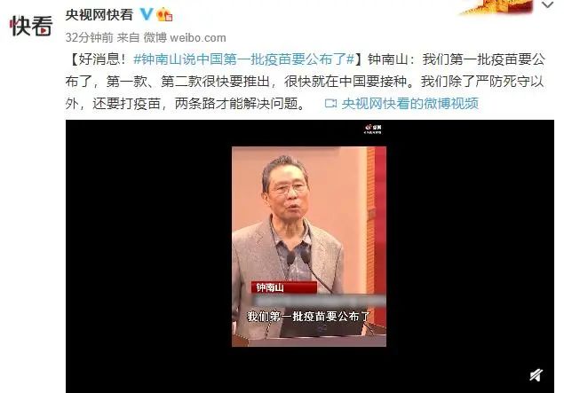 据央视网消息,钟南山表示,我们第一批疫苗要公布了,第一款、第二款很快要推出,很快就在中国要接种。