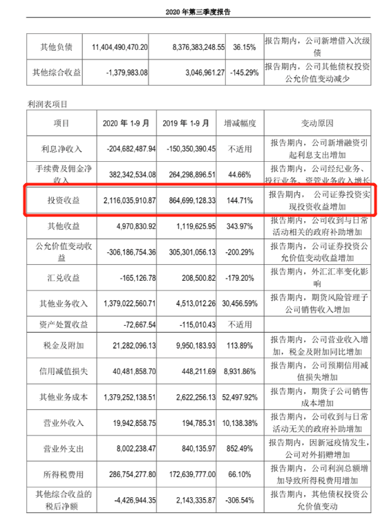 公司前三季度投资收益为21.16亿元,同比增长144.71%,主要原因依然是证券投资实现投资收益增加。