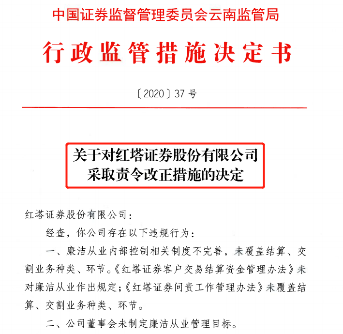 而此次属于红塔证券首次因为廉洁从业问题被监管部门责令整改。