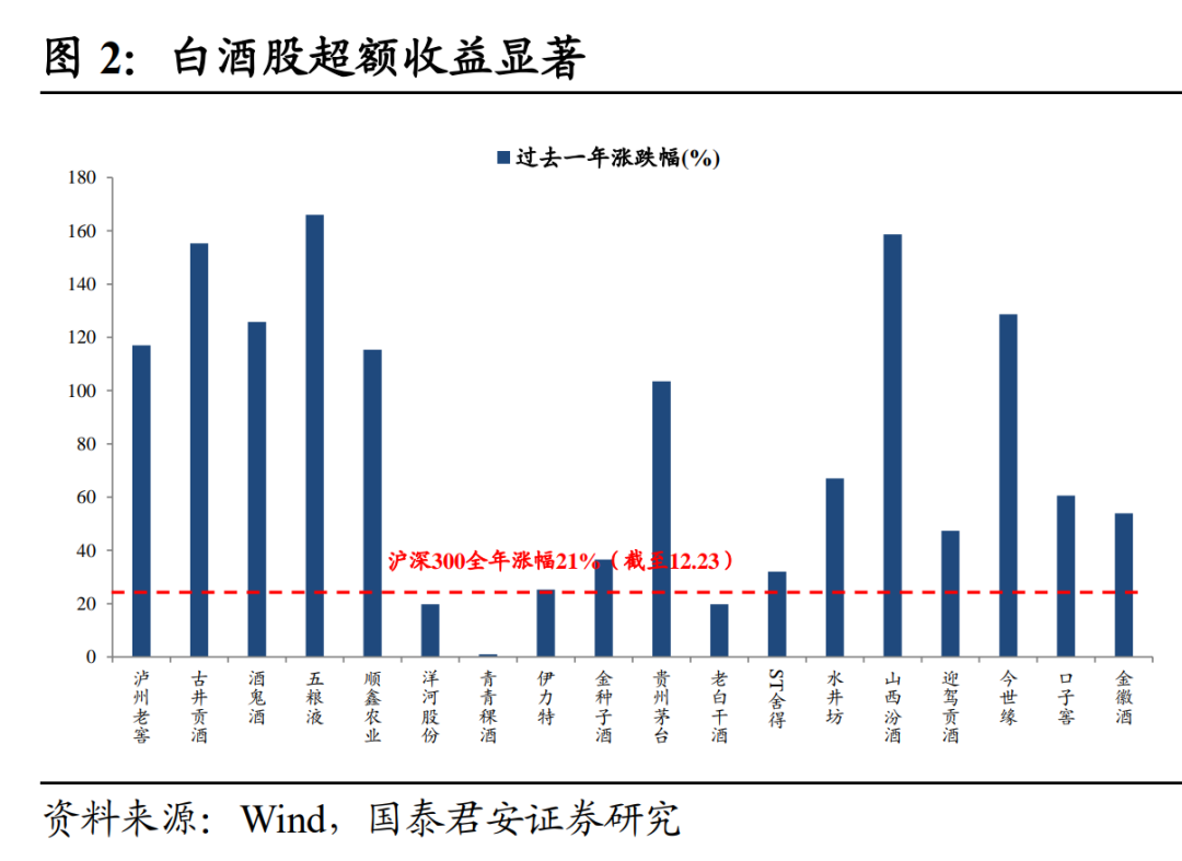 以股市为例,今年以来A股市场的短期不确定更加凸显部分股票的长期确定性优势。2020年疫情冲击后,经济短期的不确定性迅速提高,特别是下半年以来受外围影响,风险偏好持续下降。但市场愿意在低风险偏好环境下给长期确定性以更高的溢价,从而抬升永续增长行业的估值。2020年以白酒股为代表的白马股表现亮眼,远超A股平均涨幅,核心原因还是这类标的持续盈利能力强、永续现金流确定性高。