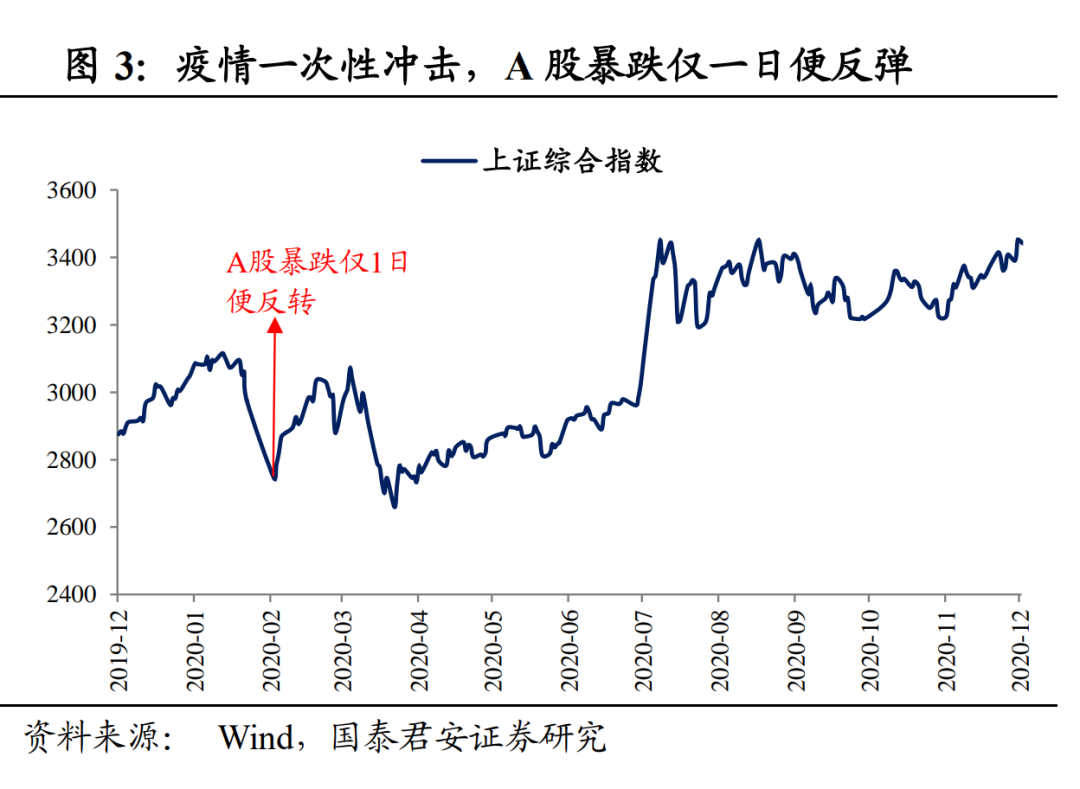 反之,一次性的冲击也不会对股市造成持续性的影响。2月3日股市开盘暴跌近8%,但暴跌仅持续一日便“V”型反转,因为疫情冲击是一次性的,而市场预期经济和企业盈利都会在疫情后迅速修复。