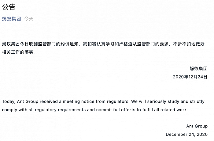 蚂蚁集团称,“今日收到监管部门的约谈通知,我们将认真学习和严格遵从监管部门的要求,不折不扣地做好相关工作的落实。”
