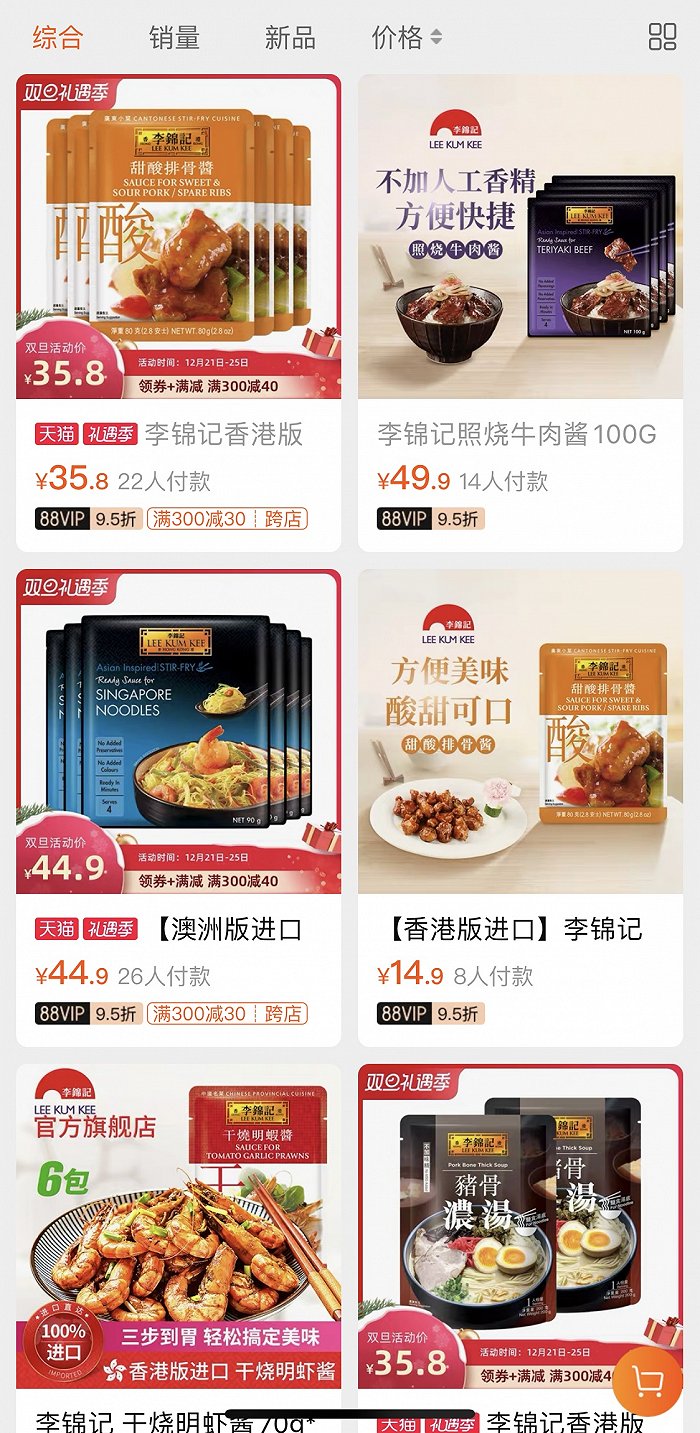 近日,海天味业在其天猫旗舰店上线了一系列“快捷方式”中式复合调味料,分别是包括香辣小炒酱、清香焖锅酱、清爽沙拉汁、高汤卤水汁、浓香红烧汁、酸甜糖醋汁、酸辣鱼香酱在内的7款产品,均采用小包装,规格分50g、60g、80g三种,目前销售单价为7.9元,7包组合售价25.9元。