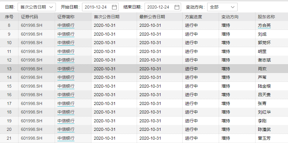 10月30日,中信银行披露了该行上市以来首次董监高大规模增持计划。