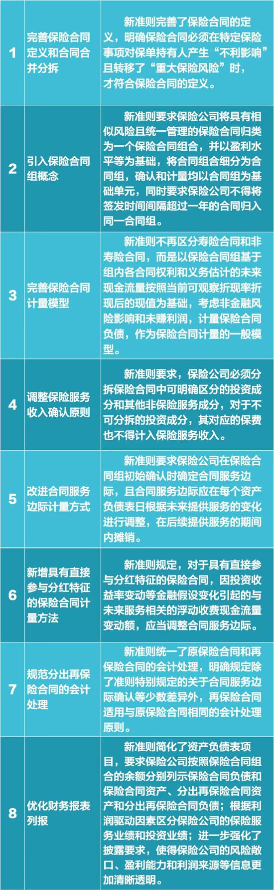 据了解,新保险合同准则在保险服务收入确认、保险合同负债计量等方面作了较大修改。具体表现为八个方面:一是完善保险合同定义和合同合并分拆。二是引入保险合同组概念。三是完善保险合同计量模型。四是调整保险服务收入确认原则。五是改进合同服务边际计量方式。六是新增具有直接参与分红特征的保险合同计量方法。七是规范分出再保险合同的会计处理。八是优化财务报表列报。